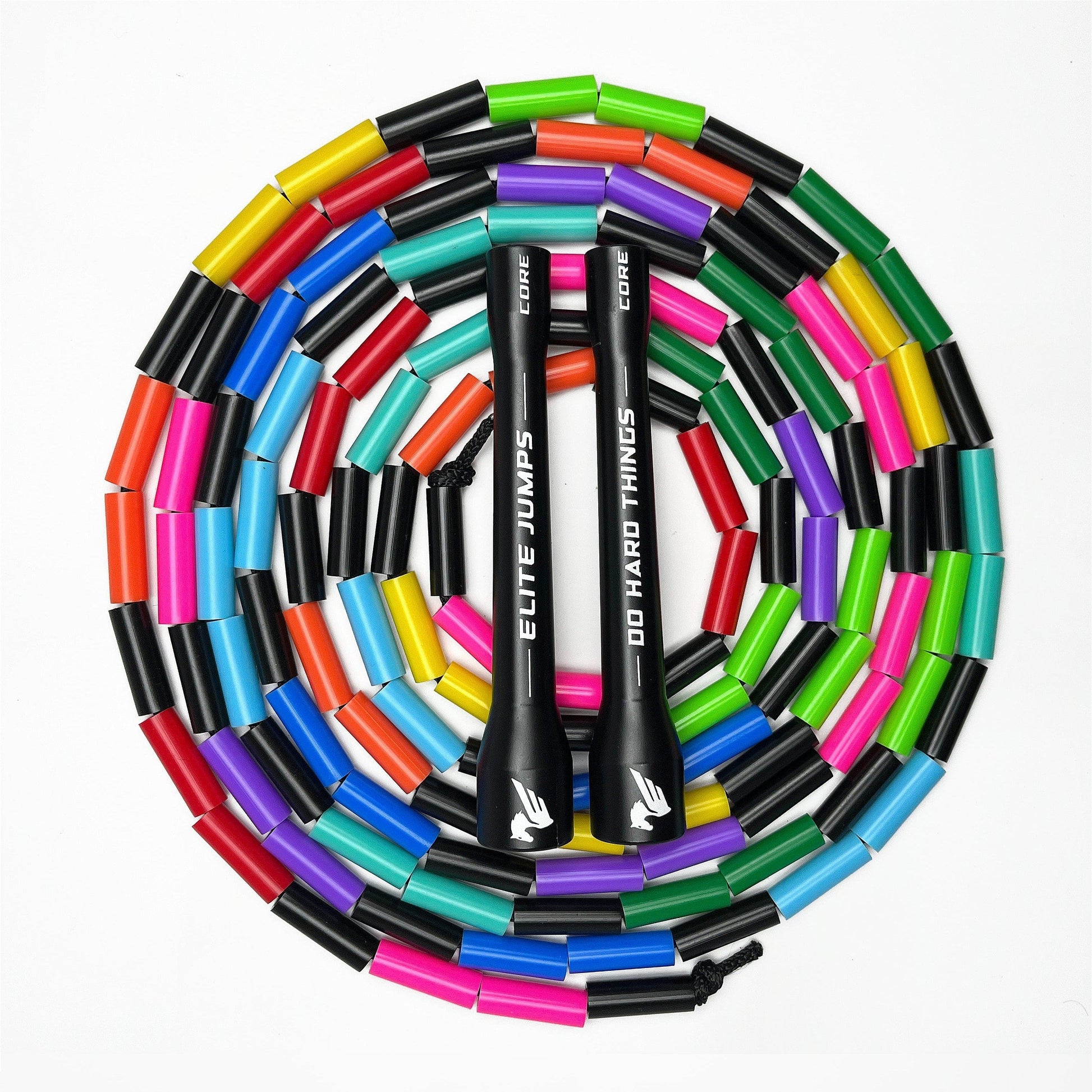 Sizing: Easily adjust the length of this segmented jump rope. The 10' length will fit jumpers up to 6'4" tall. Shorten/resize the jump rope as needed by loosening the washer/tie on one end the handle, removing beads and cutting the excess cord.